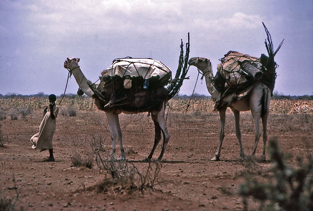 Young Somali nomad girl leading camels carrying her families possesions. The large curved sticks will support the animal skins that cover their home once they make camp.